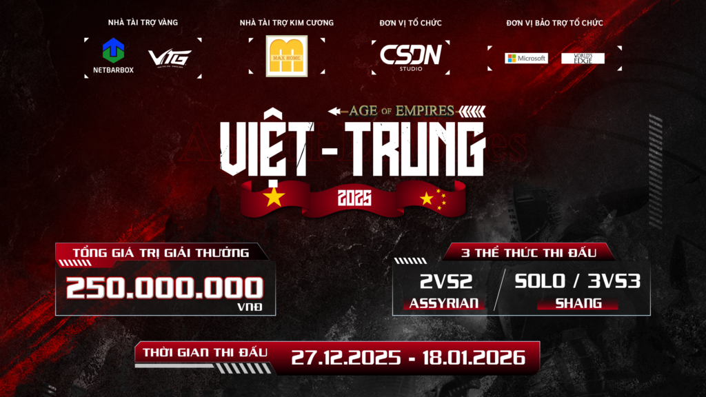 Sau khi đã có sự thống nhất giữa các đơn vị liên quan, Chim Sẻ Đi Nắng Studio chính thức công bố tổ chức giải AOE VIỆT – TRUNG 2025. Đây là giải đấu cuối cùng được tổ chức trong năm 2025 và hứa hẹn là nơi để các game thủ cả hai nước thể hiện bản lĩnh, đẳng cấp trước nhiều đối thủ mạnh.