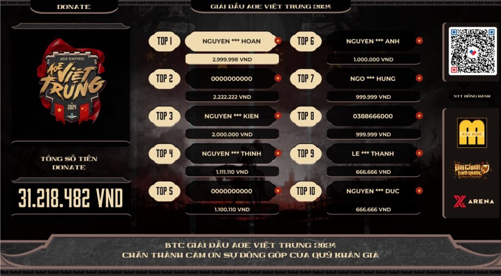 Thay mặt ban tổ chức xin gửi lời cảm ơn chân thành đến tất cả quý khán giả đã donate cũng như đồng hành theo giõi AOE Việt Trung 2024. Ngoài ra xin được vinh danh top 10 khán giả donate nhiều nhất kể từ đầu giải (danh sách trong ảnh).