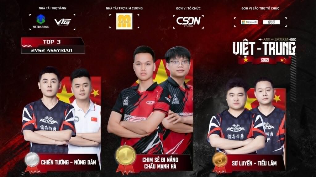 Ban tổ chức xin chúc mừng Chim Sẻ Đi Nắng – Chẩu Mạnh Hà cùng các cặp đấu đạt thành tích cao, đồng thời gửi lời cảm ơn chân thành tới khán giả đã luôn đồng hành, theo dõi và cổ vũ cho giải đấu. Khép lại nội dung 2vs2 Assyrian, giải đấu AoE Việt – Trung 2025 sẽ tiếp tục với: