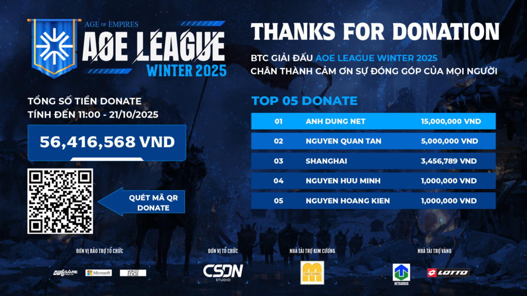 AOE LEAGUE WINTER 2025 đã diễn ra được hơn 3 tuần từ các hạng đấu League III đến League I và nhận được nhiều sự quan tâm, ủng hộ từ các khán giả theo dõi. Trong đó có rất nhiều sự động viên về cả tinh thần và vật chất vừa giúp các game thủ thi đấu thêm động lực vừa giúp giải đấu chứng minh được sự hấp dẫn.