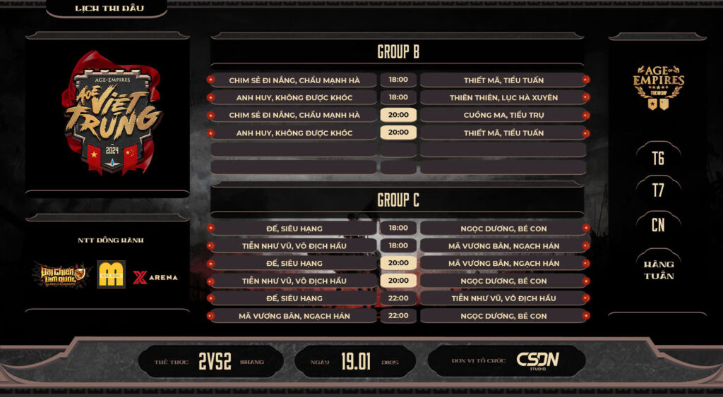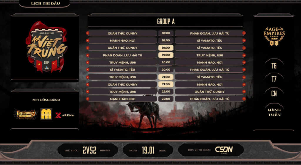 Sau khi xác định được nhà vô địch của thể thức Solo Random – Chim Sẻ Đi Nắng, AOE Việt Trung 2024 sẽ tiếp tục đến ngay với thể thức thứ 3 là 2vs2 Shang. Đây cũng là thể thức cuối cùng của giải đấu.