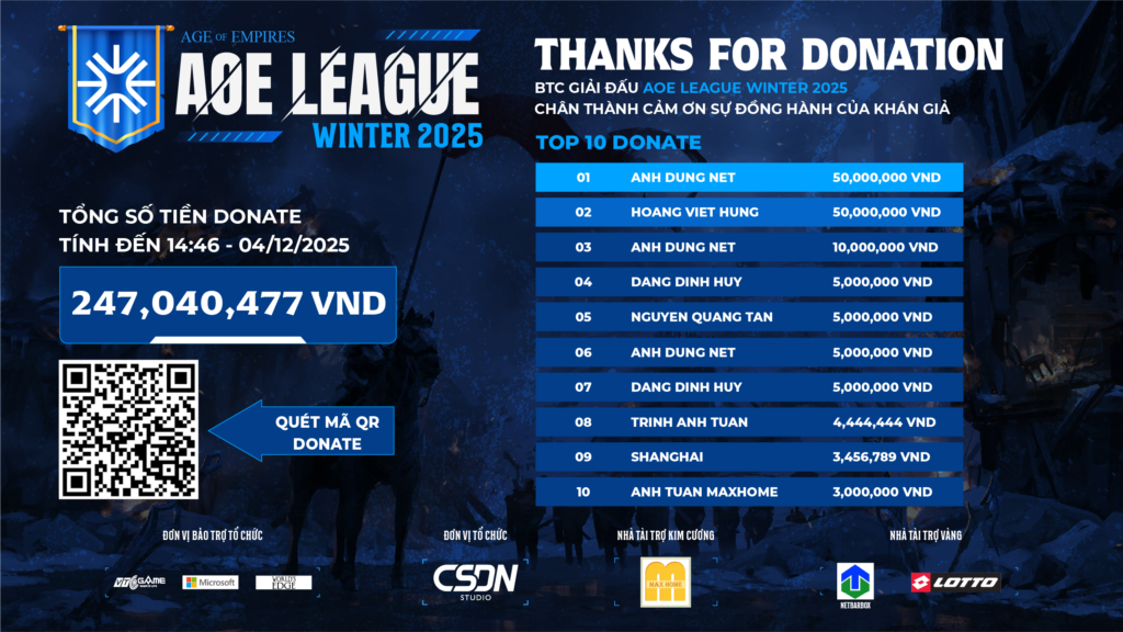 AoE League Winter 2025 đã chính thức khép lại sau một hành trình thi đấu đầy kịch tính, nơi các game thủ nỗ lực cống hiến hết mình để phục vụ khán giả và theo đuổi những mục tiêu cá nhân. Bên cạnh chất lượng chuyên môn, giải đấu năm nay ghi nhận sự ủng hộ lớn từ cộng đồng người xem, thể hiện qua lượng theo dõi trực tuyến và số tiền donate dành cho quỹ thưởng của giải.